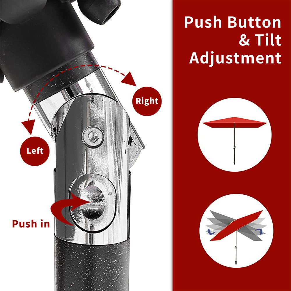 Product Design:Operates with crank lifting system for your easy and quick use. push-button tilt design makes your patio umbrella adjustable.