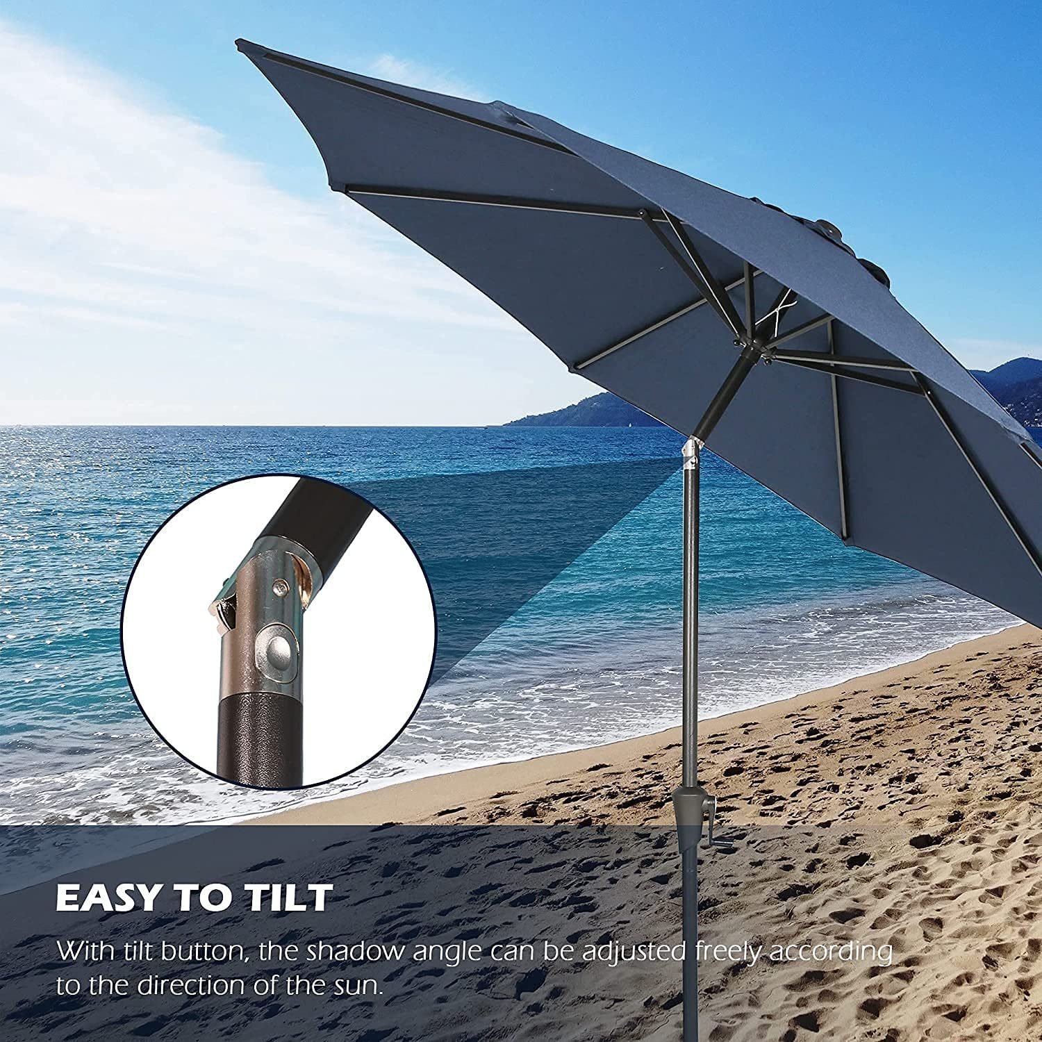 3.Designed with humanized crank to control the closing and opening. Pressing the button to tilt the umbrella in different angle