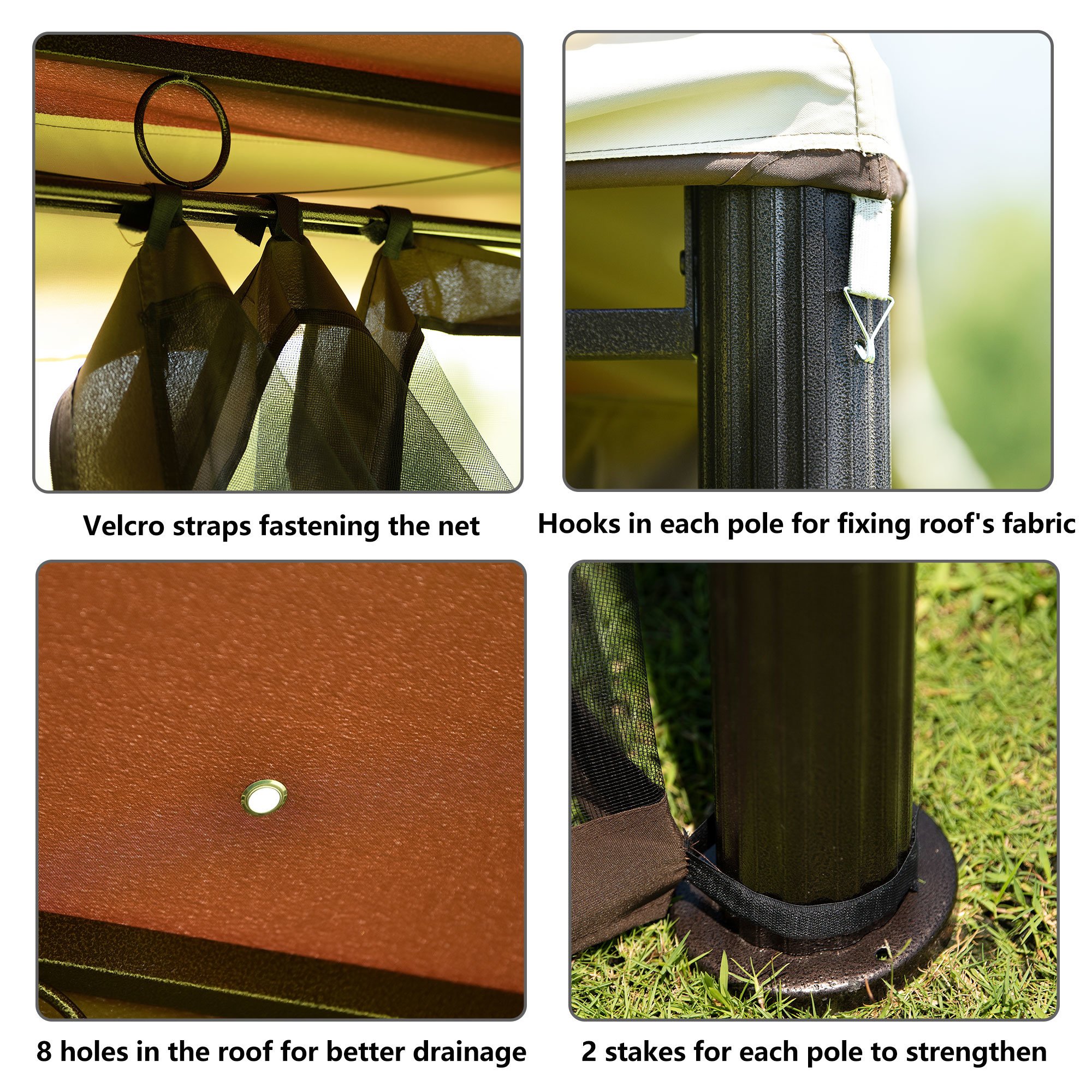 Our gazebo roofs are covered with 180g/m² polyester coated with PA painting for water resistance. Designed with 2-tier roofs, it improves the air circulation while keeping stable in windy days. 8 built-in holes in the canopy offers better drainage to avoid water accumulation in the raining. To fix the roof, there is a hook in each corner for strengthing.