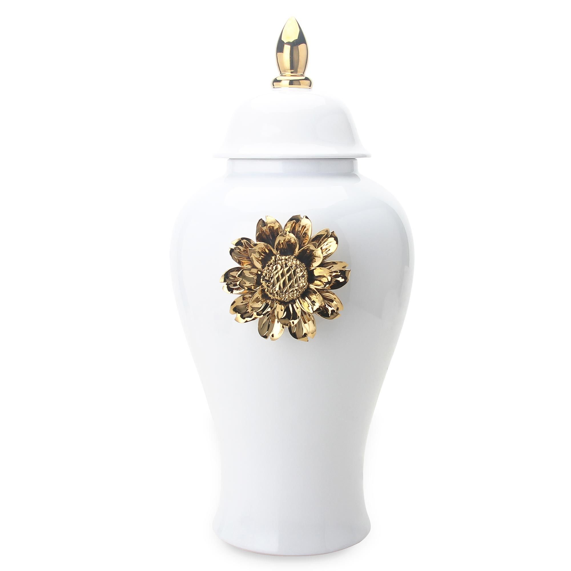 White Ginger Jar with Gilded Flower - Timeless Home Decor
